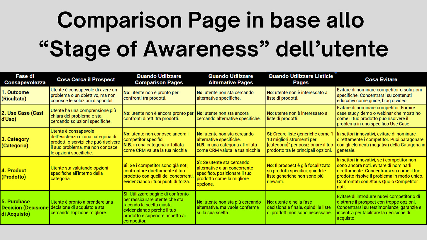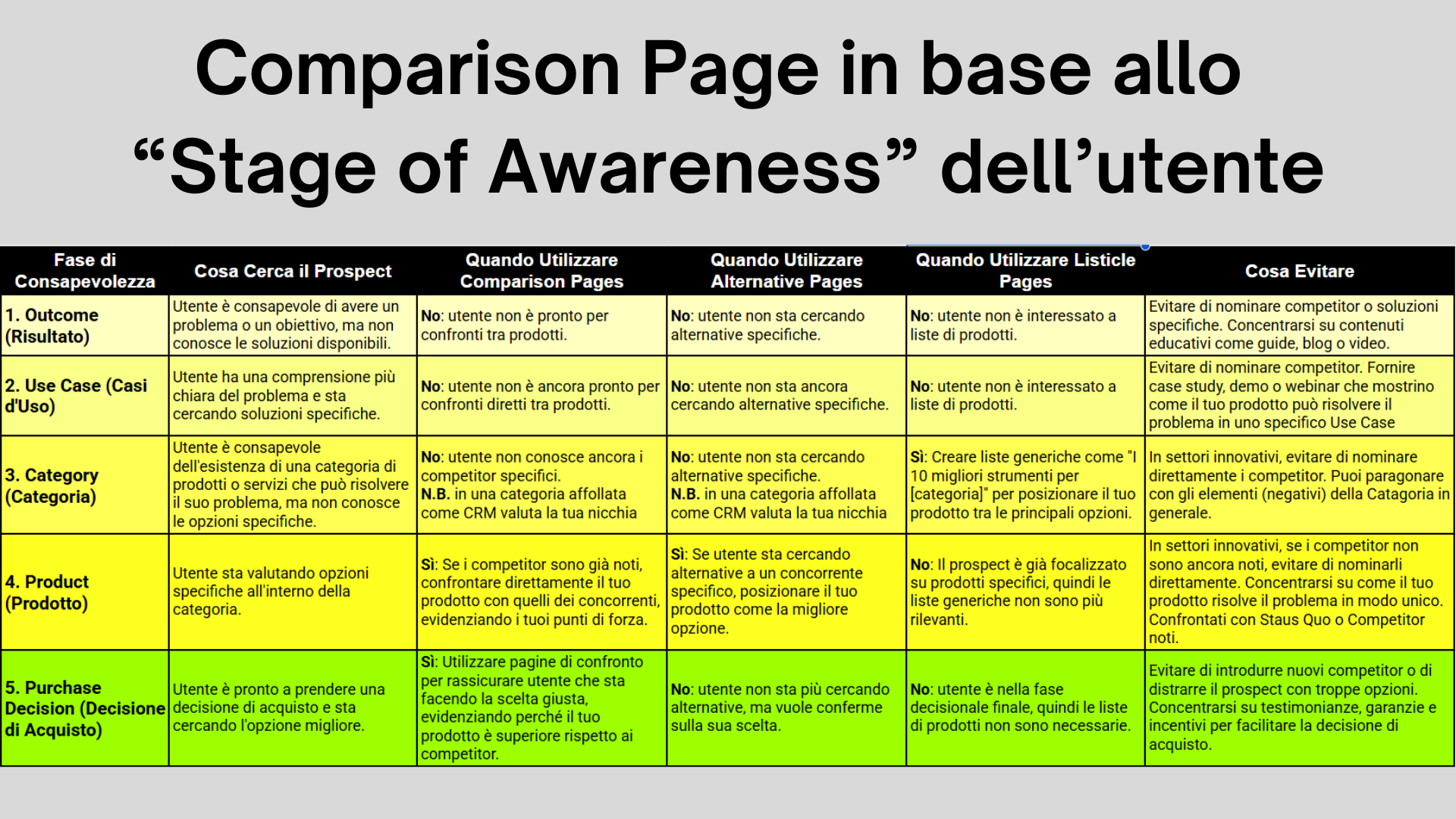 Le pagine di comparazione sono utili solo se allineate allo stadio di consapevolezza del cliente e se includono competitor già nel loro radar. Usa dati concreti per decidere chi nominare e struttura le pagine per convertire prospect già informati, senza “regalare” visibilità a concorrenti sconosciuti.